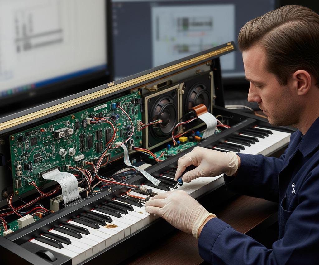 Technician inspecting internal components of a digital piano after liquid spill damage.